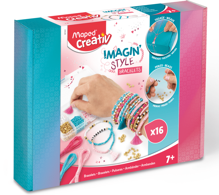 Imaginați-vă propriul stil datorită celor două tehnici de creare a brățărilor. Combinație de fire, mărgele și ciucuri pentru a crea 16 brățări cu un aspect la modă. Activitate de realizat brățări, prietenoasă pentru copii: țesere ghidată cu ajutorul cutiei și o tehnică de nod unic – brățări cu mărgele și ciucuri rapid de confecționat.Două tehnici într-o singură cutie 16 brățări de creat (6 de împletit și 10 de mărgele). Cutie de depozitare a mărgelelor inclusă: pentru o activitate „ordonată”.