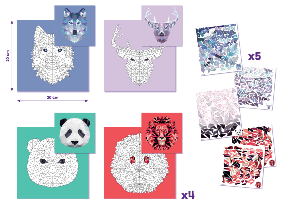 Activitate cu autocolante pe numere pentru a dezvălui frumoase portrete de animale origami! Set complet de cărți cu autocolante cu numere: Lup, Panda, Cerb și Leu. Trusă completă de 400+ autocolante pentru realizarea a 4 carduri (înălțime de aproximativ 20 cm). Evolutiv: 4 carduri cu 4 niveluri de dificultate. Rezultat garantat: copiii urmăresc numerele de pe autocolante. O tematică la modă: imagini frumoase de păstrat sau de oferit! Învățare: dezvoltă răbdarea și atenția